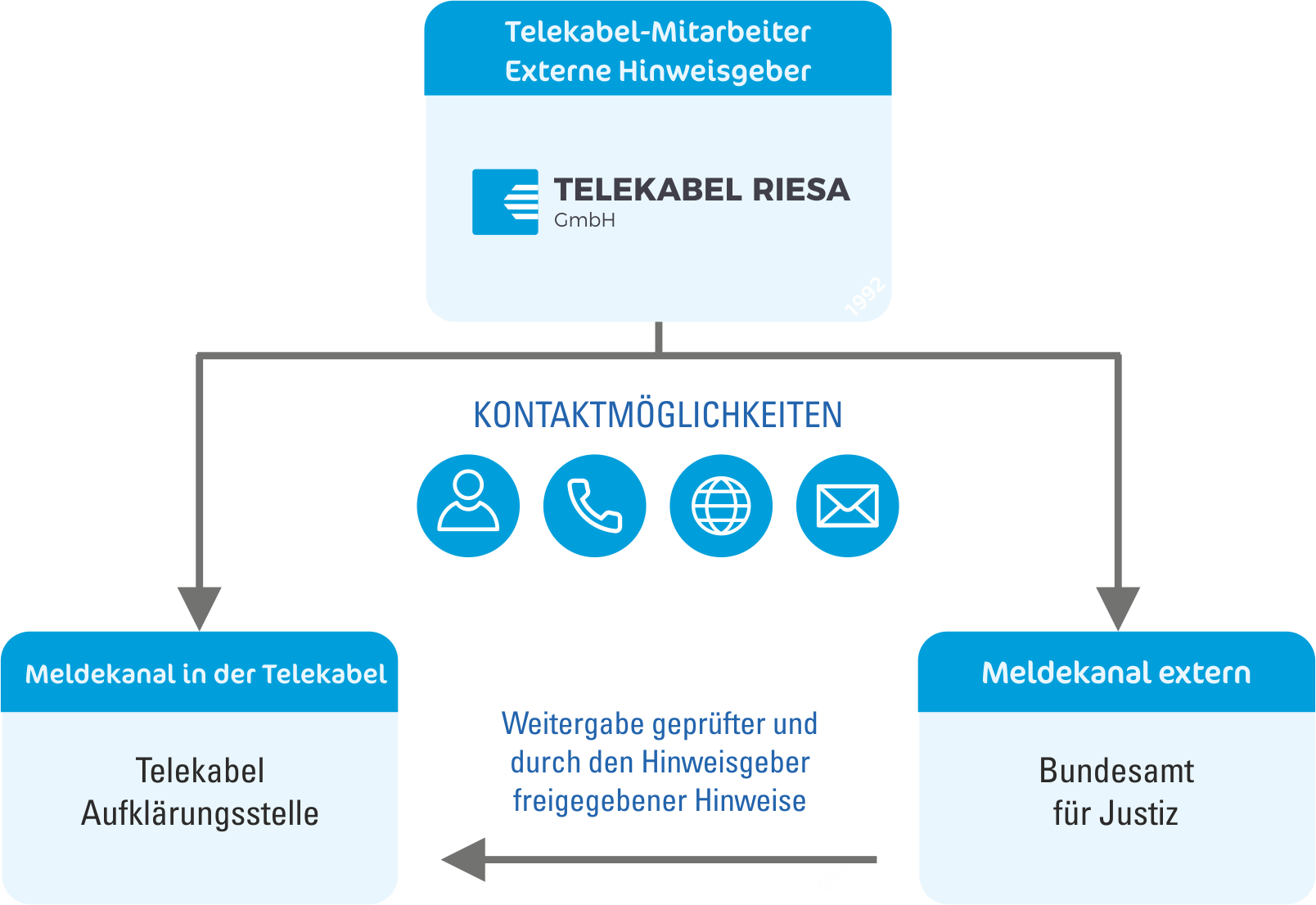 Die Einhaltung von Gesetzen, Regeln und internen Vorgaben hat bei der Telekabel Riesa GmbH höchste Priorität. Unser Hinweisgebersystem nimmt konkret Anhaltspunkte für potenzielles Fehlverhalten von Mitarbeitern und Mitarbeiterinnen sowie von externen Hinweisgebern der Telekabel Riesa entgegen.